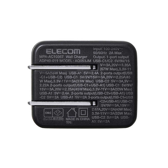 出力 USB-C1/2:5・9・15V/3A、20V/3.35A(最大67W)/PPS:3.3〜11V/5A(最大55W)/USB-A:5V/2.4A(最大12W)