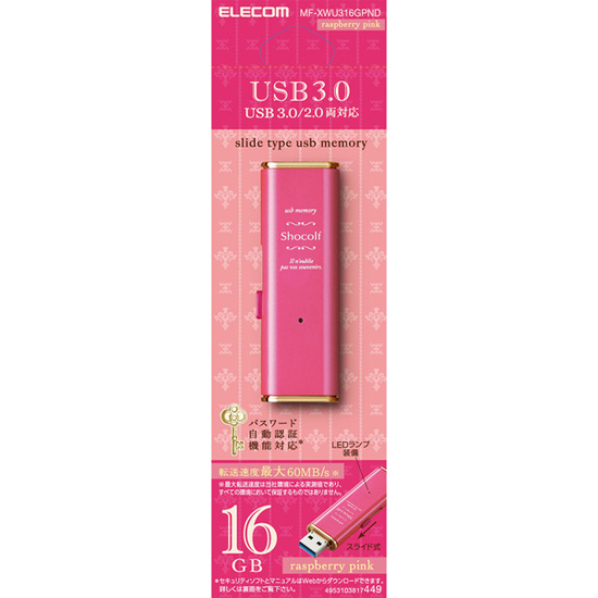 甘すぎない上品なかわいらしさを演出。USB3.0対応で最大60MB/sの高速データ転送を実現し、キャップレスのスライド式を採用したUSBメモリ“Shocolf(ショコルフ)”。