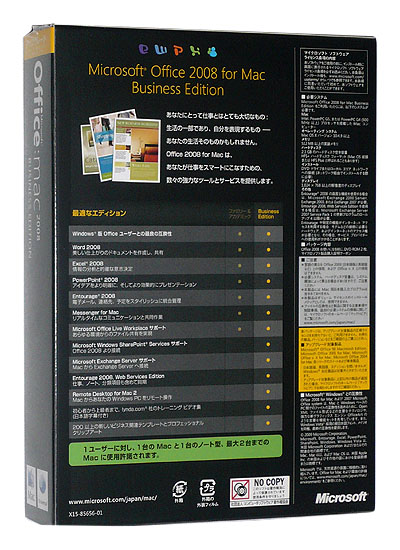 ■商品説明■ あなたにとって仕事とはとても大切なもの:生活の一部であり、自分を表現するもの――あなたの生活そのものかもしれません。 Office 2008 for Mac は、あなたが仕事をスマートにこなすための、数々の強力なツールとサービスを提供します。