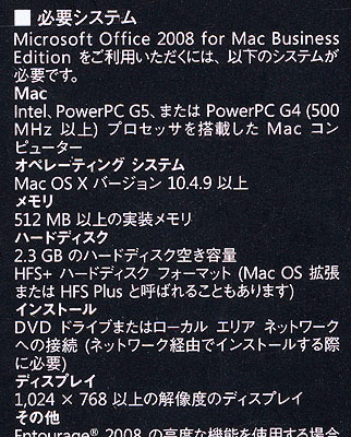 ◆Windows 版 Office ユーザーとの最良の互換性 ◆Word 2008 美しい仕上がりのドキュメントを作成し、共有 ◆Excel 2008 情報の分析と的確な意志決定 ◆PowerPoint 2008 アイデアをより明確に、そしてより効果的にプレゼンテーション ◆Entourage 2008 電子メール、連絡先、予定をスタイリッシュに統合管理 ◆Messenger for Mac リアルタイムなコミュニケーションと共同作業 ◆Microsoft Office Live Workspace サポート あらゆる環境からのファイル共有を実現 ◆Microsoft Windows SharePoint Services サポート Office 2008 より接続 ◆Microsoft Exchange Server サポート Mac から Exchange Server へ接続 ◆Entourage 2008 Web Services Edition 仕事、ノート、分類項目も含めて同期 ◆Remote Desktop for Mac 2 Mac からあなたの Windows PC をリモート操作 ◆初心者から上級者まで、lynda.com 社のトレーニング ビデオ集(日本語字幕付き) ◆200 以上の新しいビジネス関連テンプレートとプロフェッショナルクリップアート