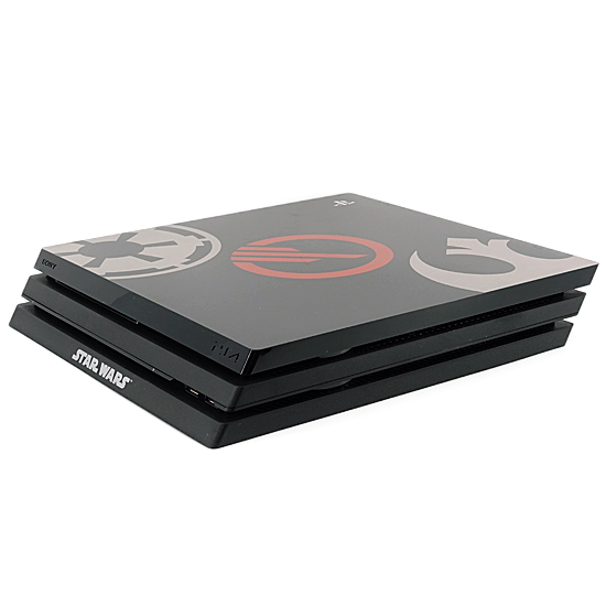 PS4 Pro本体は、鏡面加工を施したジェット・ブラックを基調に、「スター・ウォーズ」シリーズでおなじみの反乱同盟軍、銀河帝国軍、そして『Star Wars バトルフロント II』に登場する銀河帝国軍の精鋭インフェルノ隊──これら3つのロゴを配し、ゲームの内容とリンクするデザインに仕上げています