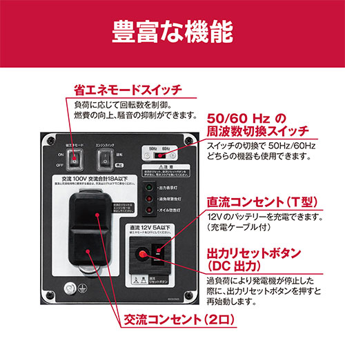 使用する電気機器の負荷に合わせてエンジン回転数を制御して燃料消費を抑える省エネモード付です。