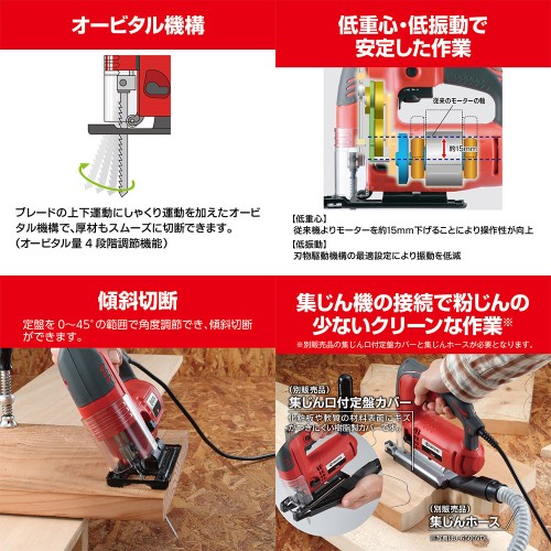 ブレードの上下運動にしゃくり運動を加えたオビタル機構により厚材の切断もスムーズに行えます。
