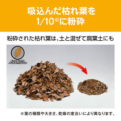 吸い込んだ枯葉などを約1/10に粉砕、ごみの捨て時がわかる透明なダストバッグは、ビニール素材なのでスムーズに枯れ葉を排出できます。
