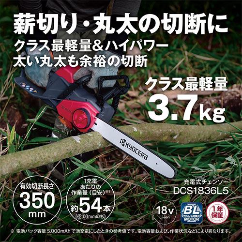 ●付属品:電池パック(B-1850LA)×1個・充電器(UBC-1802L)×1個・ガイドバー×1個・ソーチェン(90PX-52)×1個・チェンカバー×1個・チェンオイル(50mL)×1個。