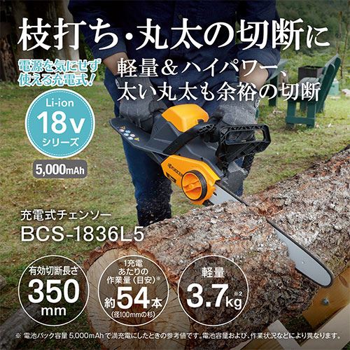 ●付属品:電池パック(B-1850LA)・充電器(UBC-1802L)・ガイドバー・ソーチェン(90PX-52)・チェンカバー・チェンオイル。