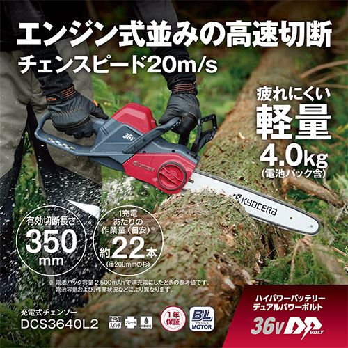 小型大出力の高効率モーターを搭載し、電池パック込の質量が4.2kgと小型エンジン式チェーンソーと同等の重量感です。
