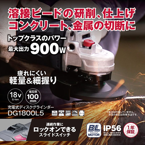 握り部周長144mmの細握りで作業者の疲労を軽減し、丸型ヘッドによりどの角度でも安定した切込深さを実現した砥石径100mmの連続作業にロックオンできるスライドスイッチを採用しました。