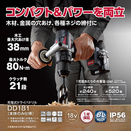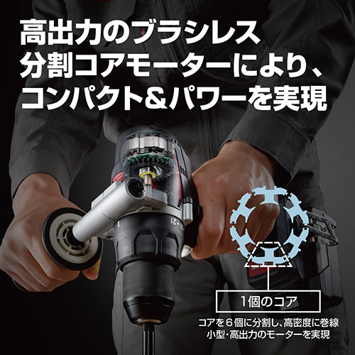 ブラシレス分割コアモーターを搭載してコンパクト・パワー・スピーディーを実現した18Vタイプの充電式ドライバドリルです。