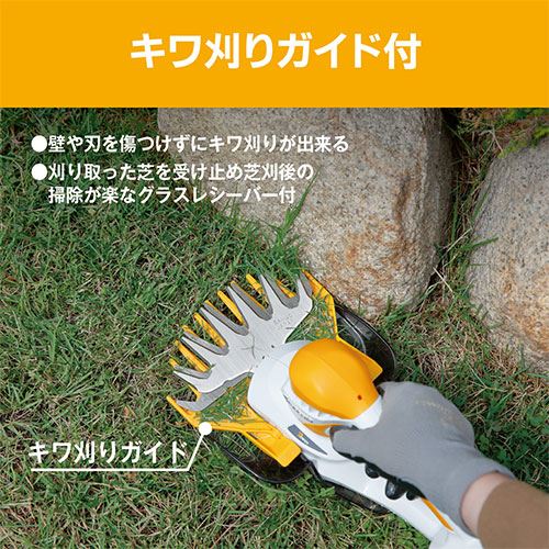 刈り込み部が見え、壁が低くてもキワ刈り可能な使い勝手の良いキワ刈りガイドを採用しています、。
