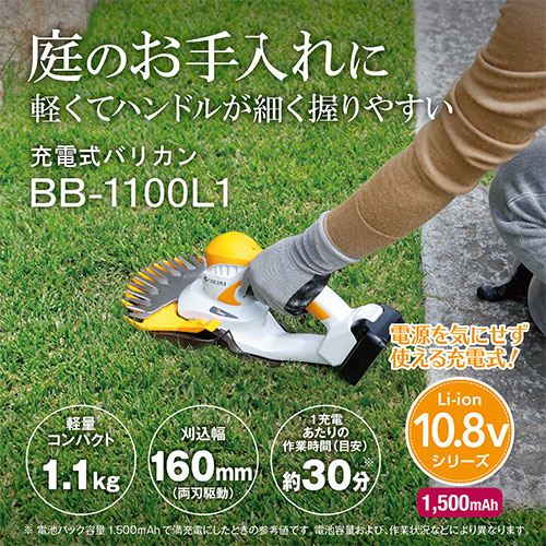 ●付属品:ブレード(160mm/本体取付)×1個・ブレードカバー(本体取付)×1個・グラスレシーバー(本体取付)×1個・キワ刈りガイド(本体取付)×1個・充電器(UBC-1803L)×1個・電池パック(B-1115L)×1個。