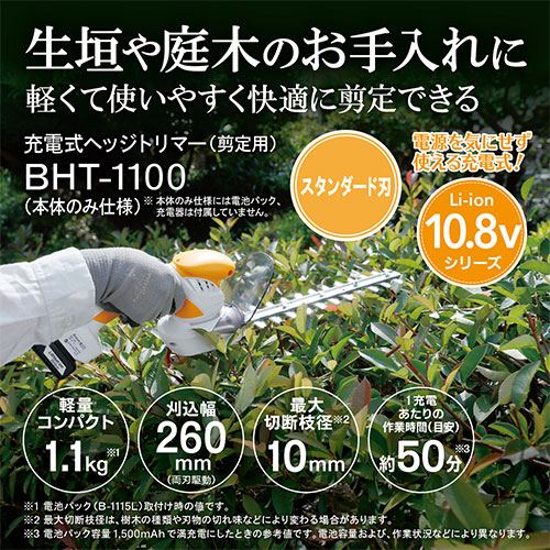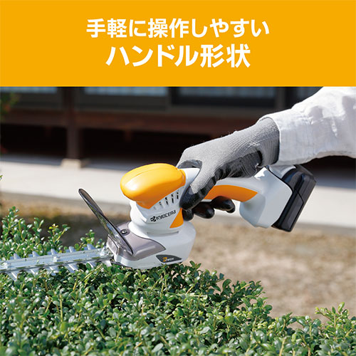 細握り形状で長時間作業でも疲れにくく、女性や高齢者でも使い易い軽量・コンパクトな10.8Vタイプの充電式ヘッジトリマーです(充電器・電池パックは別売です)。