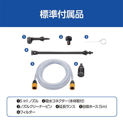 ●付属品:吸水コネクター(本体取付)×1個・自吸ホース(5m)×1個・延長ランス×1個・5in1ノズル×1個・ノズルクリーナピン×1個。