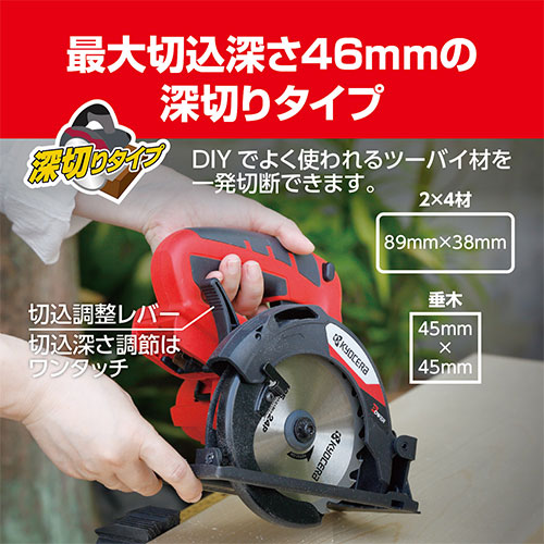 DIYで使用頻度の高いツーバイ材(38mm)、垂木(45mm)の1発切断が可能です。