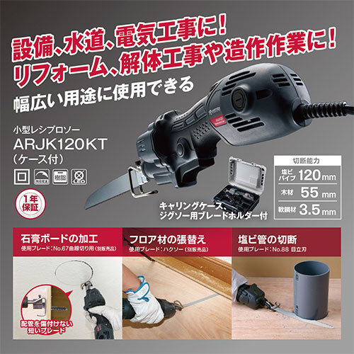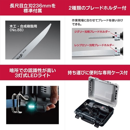 ●付属品:レシプロソーブレードNo.88(236mm)・六角棒レンチ3mm(コード装着)・ブレードホルダ(レシプロソー刃用×1個・ジグソー刃用×1個)・キャリングケース。