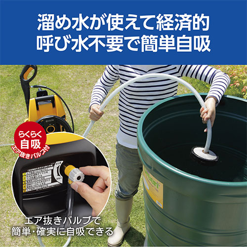 作業範囲の拡大ができる10Mの高圧ホースを標準付属、エア抜き不要の自吸機能が付いており溜水での洗浄もできる経済的な高圧洗浄機です。