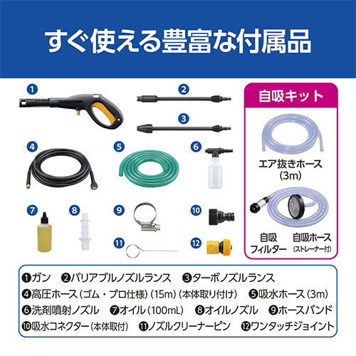 ●付属品:高圧ホース(15m)×1・バリアブルノズルランス×1・ターボノズルランス×1・吸水コネクター×1・ワンタッチジョイント×1・ノズルクリーナーピン×1・給水ホース(3m)×1・ホースバンド×1・自吸フィルター×1・自吸ホース(ストレーナー付)×1・エア抜きホース(3m)×1・オイル(100mL)×1・オイルノズル×1。