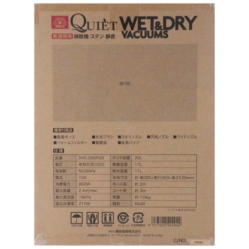 ●付属品:ワイドノズル、汎用ノズル、隙間ノズル、丸毛ブラシ、延長パイプ×2、集塵ホース、集塵袋×2、カートリッジフィルター(本体装着済み)、スポンジフィルター、キャスター×4。