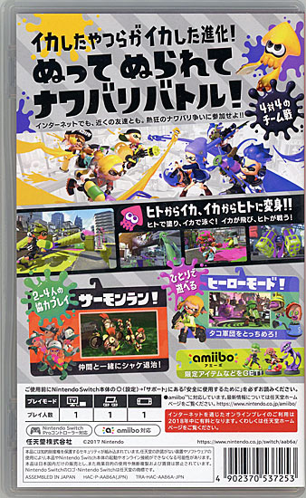 4対4で地面にインクを塗り合い、インクを塗った面積の多いチームが勝利という明快なルールのアクションシューティング。ヒトに変身するあのイカが、大きく進化してNintendo Switchにやってくる。