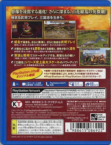 PS Vita版では、他プラットフォーム版にはないオリジナル要素を追加し、ますますパワーアップ。携帯機の特徴を生かして、いつでもどこでも場所を選ばずお手軽に、プレイヤー自身の思い描く生き方を三国志世界に刻むことができる。