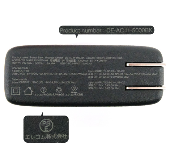 出力 単独接続時:5V/3A、9V/2.22A/2ポート同時接続時 USB Type-C1/C2:5V/1.5A/最大出力20W