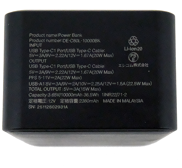出力 USB-Cポート/ケーブル:最大12V/1.67A/PPS:5-11V/2A/USB-A:最大12V/1.5A/複数ポート同時:5V/3A