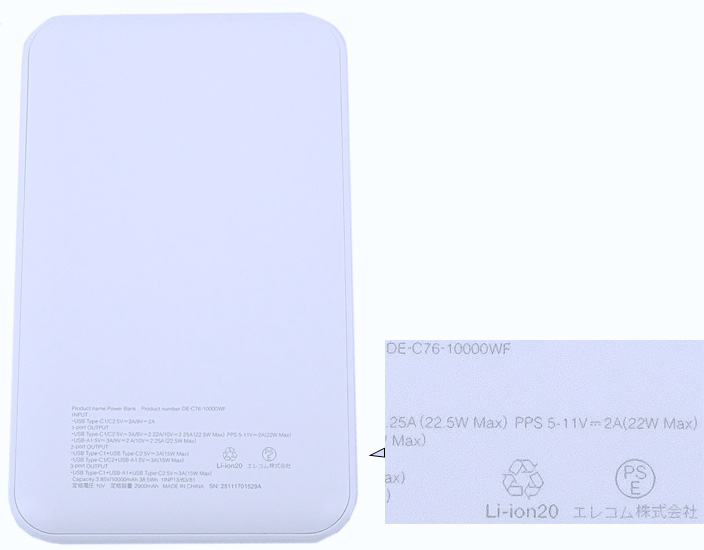 出力 USB-C1/C2:最大10V/2.25A/PPS:5-11V/2A/USB-A:最大10V/2.25A/複数ポート同時:5V/3A