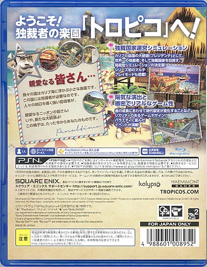 プレイヤーは美しくも貧しい南国「トロピコ」に君臨する唯一無二の独裁者である「プレジデンテ」合法無法を問わず、様々な手段で自らの理想国家を目指す。(引退した暁には安定した余生を過ごすため、スイスに口座を開くこともお忘れなく。)
