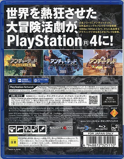 シリーズ全世界累計出荷数2100万本を突破(2015年5月時点)したPS3を代表する人気シリーズ「アンチャーテッド」が、PS4用にリマスターされ登場。2007年発売『アンチャーテッド エル・ドラドの秘宝』、2009年『アンチャーテッド 黄金刀と消えた船団』、そして、2011年『アンチャーテッド ‐砂漠に消えたアトランティス‐』の3作品を収録。