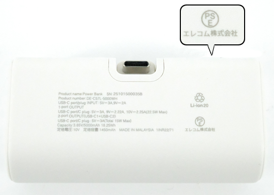 出力 USB Type-Cポート/プラグ:5V/3A、9V/2.22A、10V/2.25A/最大出力22.5W